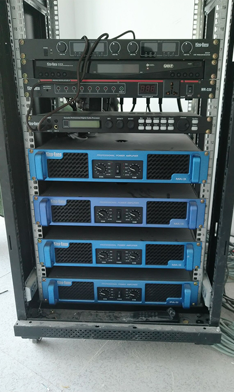 放大設備——指對經過調控設備混音輸出、信號處理后的信號進行后級功率放大設備,這里指專業功率放大器;重放設備——指將經過后級功率放大器放大的音頻信號進行電—聲轉換并釋放表現出來人耳可懂的聲頻信號的設備,這里指揚聲器;
