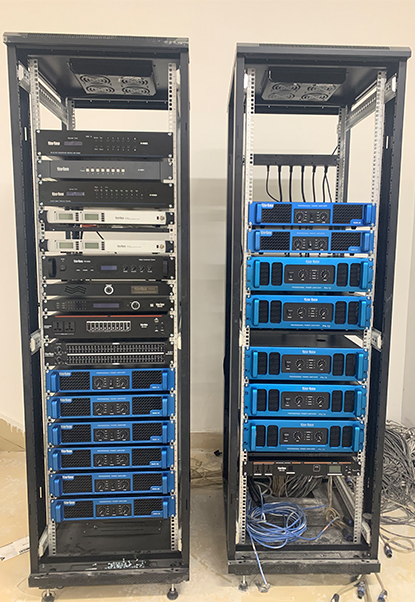 放大設備——指對經過調控設備混音輸出、信號處理后的信號進行后級功率放大設備,這里指專業功率放大器;重放設備——指將經過后級功率放大器放大的音頻信號進行電—聲轉換并釋放表現出來人耳可懂的聲頻信號的設備,這里指揚聲器;