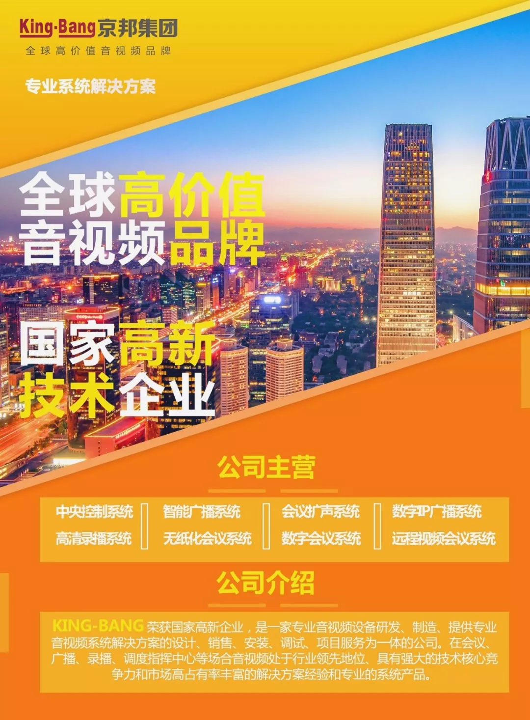 京邦電子(KING-BANG)做為全球高價值的音視頻品牌,連續(xù)五年(2014、2015、2016、2017、2018)被評為十大公共廣播品牌、十大會議系統(tǒng)品牌,榮獲國家高新技術(shù)企業(yè),被中國質(zhì)量協(xié)會評為全國音響行業(yè)質(zhì)量領(lǐng)先品牌、全國質(zhì)量誠信標(biāo)桿典型企業(yè)、全國質(zhì)量檢驗(yàn)穩(wěn)定合格產(chǎn)品,并產(chǎn)品成功應(yīng)用于2008年北京奧運(yùn)會、2010年廣州亞運(yùn)會、三峽大壩等國家級重點(diǎn)工程,全國成功案例突破十萬個。